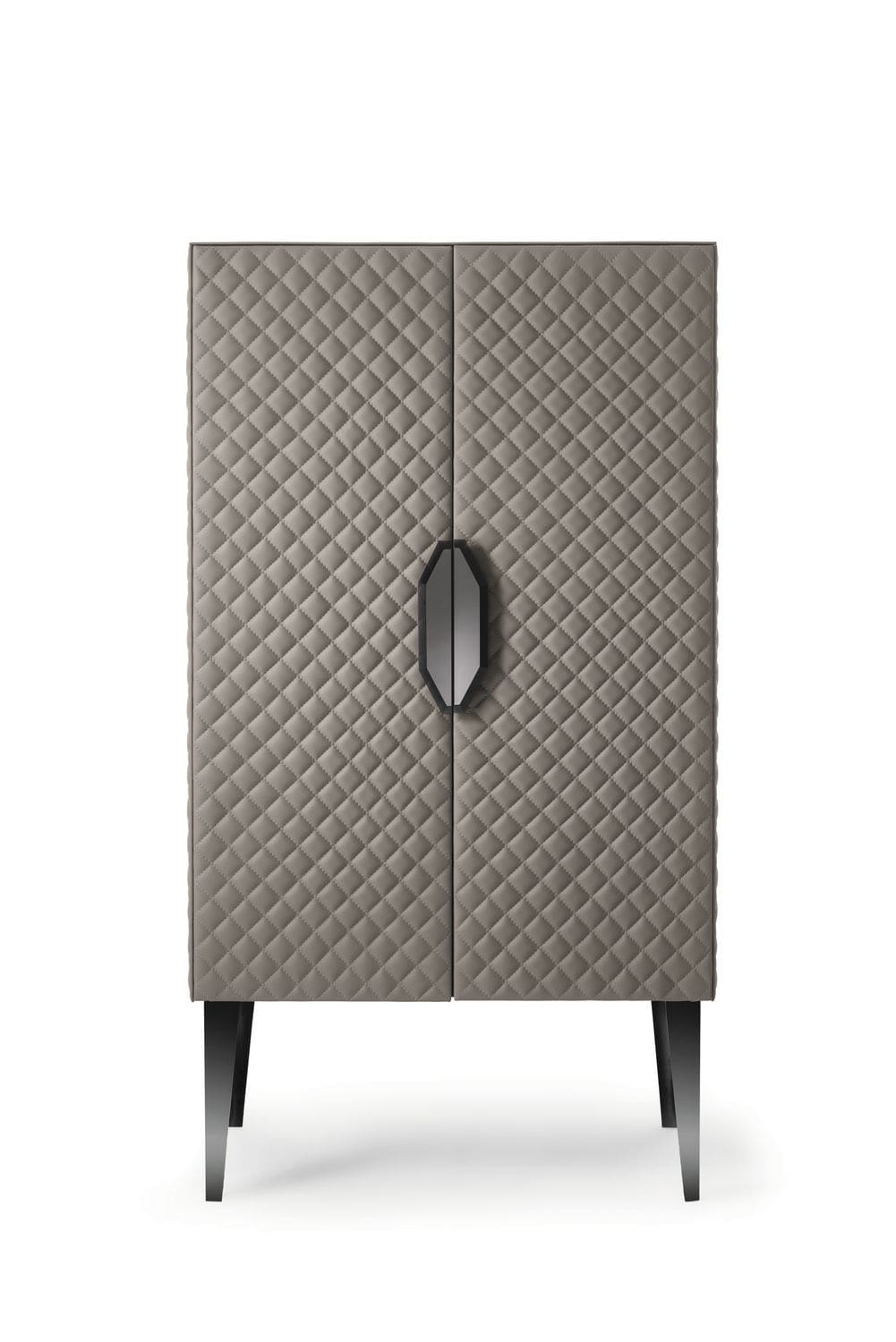Ein raffiniertes Leder verziert die Wände des Möbelstückes. Er ist Duccio, der Anrichtetisch aus der Sammlung von Veblén. Ein kostbares Objekt aus feinem Material und analysiert bis ins kleinste Detail: eine interne Schublade aus lackiertem Holz, halbreflektierender Glasgriff, Beine aus Messing mit schwarzem Nickel Ausführung.