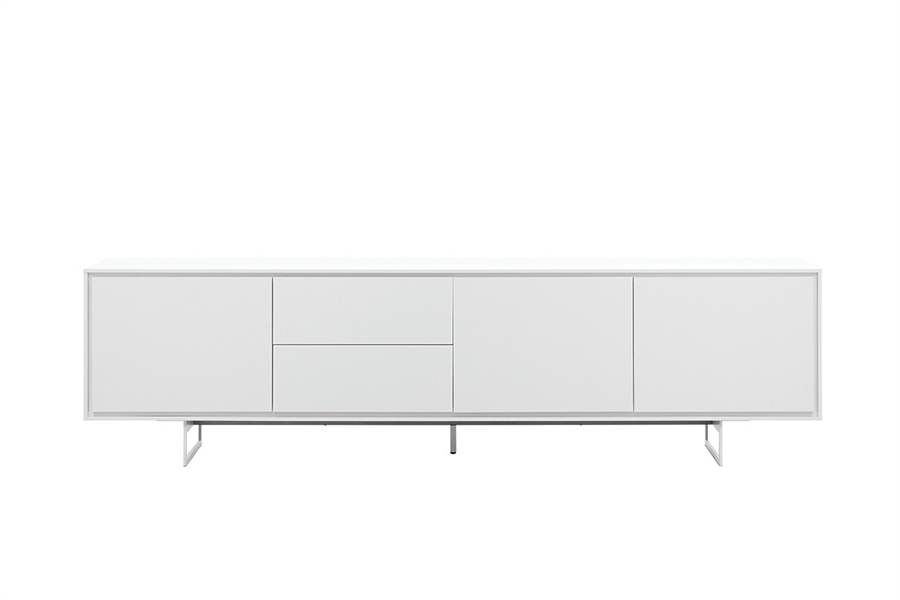 Das Sideboard Shadows steht auf grazilen Metallbeinen, die verchromt oder lackiert gestaltet werden können und zeichnet sich durch eine um Türen und Schubläden laufende Griffrille aus.
