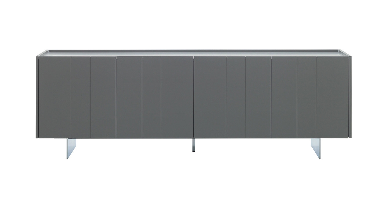 Die Abfolge der senkrechten Linien vermitteln Rhythmus und Bewegung. Die Türen überragen die Deckplatte leicht und ermöglichen dadurch ein bequemes Öffnen des Sideboards. Das sind die Eigenschaften des Sideboards Stripe mit seinen senkrechten Streifen aus verchromtem Metall.