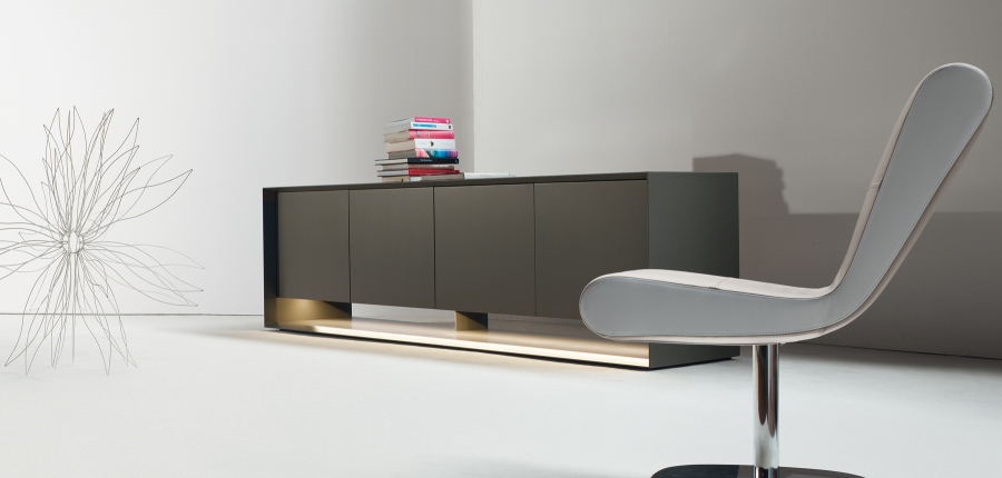 Besonderes Sideboard, das sich durch eine elegante Struktur aus lackiertem Holz und einen besonderen Unterbau auszeichnet. Auch in der Version mit Licht (Sunrise Light). Lichtquelle LED, die in der unteren Öffnung positioniert ist.