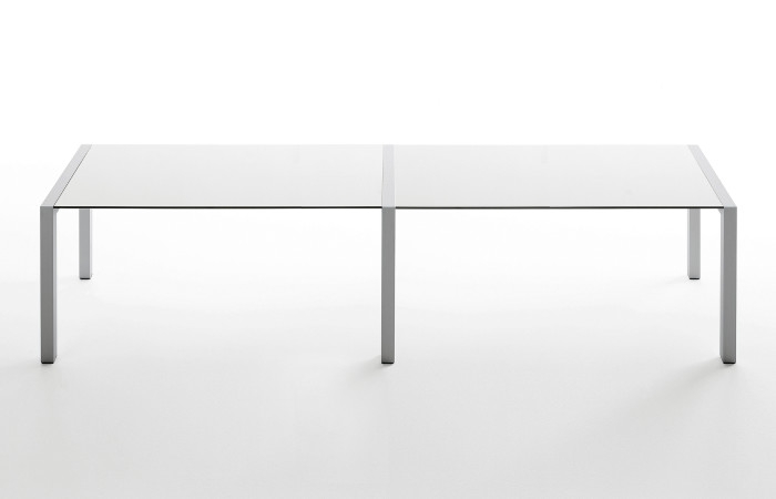 Ein vollständiges und technologisch ausgereiftes Programm von Büroschreibtischen, um jedem Arbeitsraum eine zeitgenössische Note mit minimalistischem Design zu schenken. Durch den Einsatz von Schreibtischen, großen Arbeitstischen und Workstations mit Kabeldurchlässen können die unterschiedlichsten Zusammenstellungen entworfen werden, um Einzel- oder Mehrfacharbeitsplätze, elegante Lösungen für Besprechungszimmer und hochwertige Arbeitsplätze für Direktionsbüros zu schaffen. Die mit einem schmalen Profil ausgestatteten Tischplatten stehen in drei Materialien zur Auswahl: aus Schichtlaminat Alucompact®, ein dank der eingepressten Aluminiumfolien besonders widerstandsfähiger Werkstoff; aus Aluminium mit Wabenstruktur und Eichenfurnier in Farbe Wengè oder Grau; aus rückseitig lackiertem Glas in glänzender Ausführung in allen Farben der Musterkarte RAL/NCS oder mit matter fingerabdruckresistenter Spezialbehandlung. Die besonders starken Beine bestehen aus eloxiertem Aluminium oder sind in Farbe der Tischplatte lackiert, um einen gleichmäßigen Farbeffekt zu erzielen. Die Büroschreibtische können mit einem Sichtschutzpaneel aus mattem Methacrylat ergänzt werden, das Privacy und Transparenz auf einen Nenner bringt.