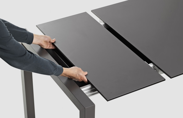 Der minimalistische Charme des Tischs Sushi zeigt sich bei der Version für den Außenbereich von seiner besten Seite und ist in fixer oder verlängerbarer Version erhältlich. Der verlängerbare Tisch für den Außenbereich ist mit demselben Ausziehmechanismus wie das Modell für den Wohnbereich ausgestattet. Der zur Unterbringung der Verlängerungen vorgesehene Behälter besteht aus robustem thermogeformtem Kunststoff und besitzt Öffnungen für den Abfluss des Regenwassers. Die Struktur aus Aluminium und die Beschläge aus Edelstahl gewährleisten für viele Jahre höchste Beständigkeit.