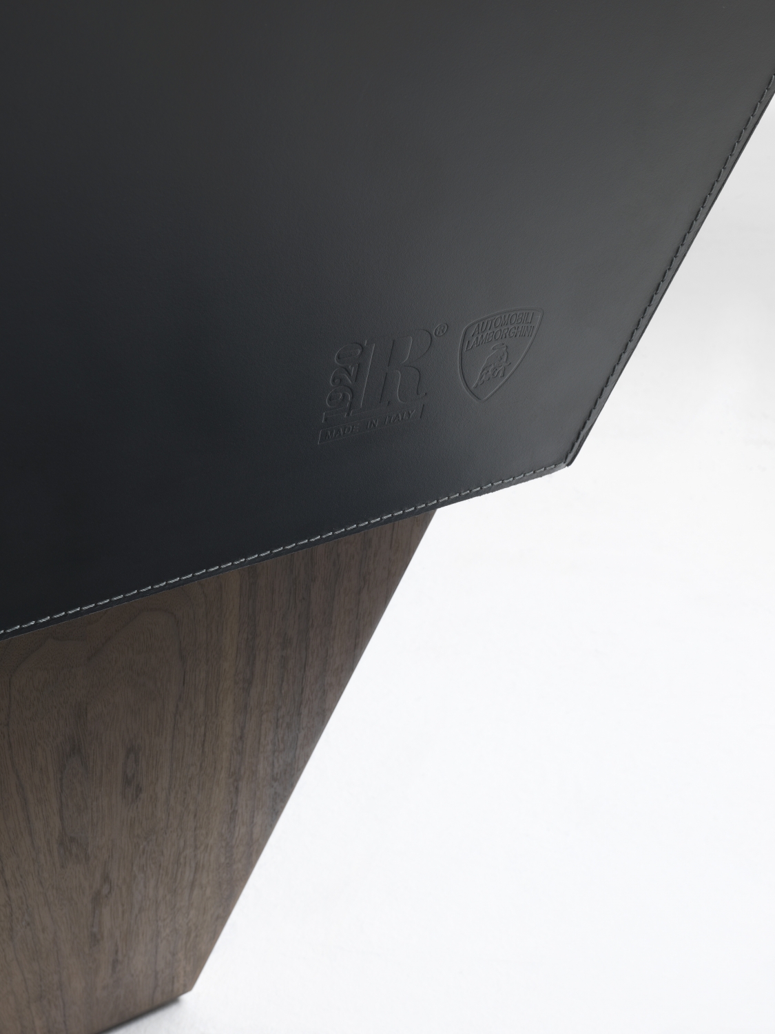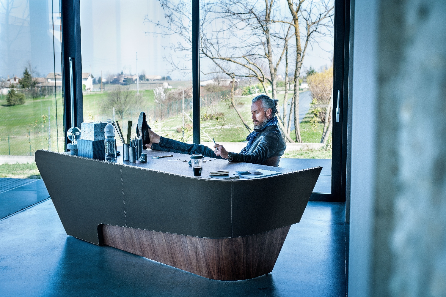 Der Schreibtisch zeichnet sich durch die Leichtigkeit der Linien aus und besteht aus einer Massivholzplatte und Leder bezogenen Fronten.