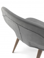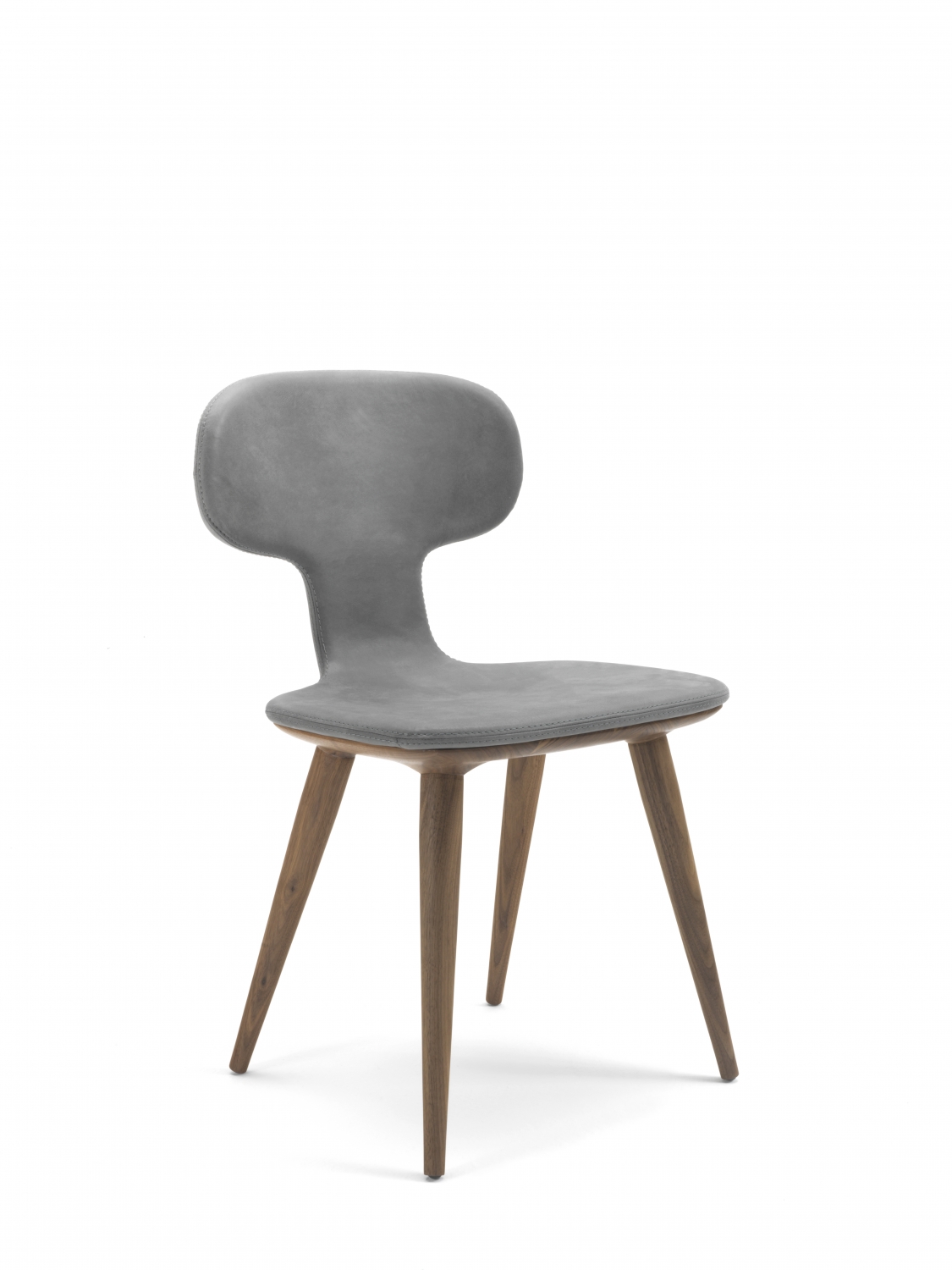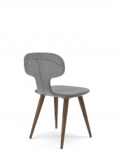 Gepolsterter Stuhl, mit Leder und dekorativen, sichtbaren Nähten überzogen. Die geformte Struktur aus Massivholz zeichnet sich durch Leichtigkeit der Volumen aus.
