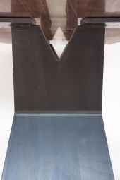 Tischbasis in Eisenblech, gekennzeichnet durch geometrische Linien. Ausführung: basierend auf natürlichem Wachs oder Öl, pflanzlicher Ursprung mit Kiefernextrakten.