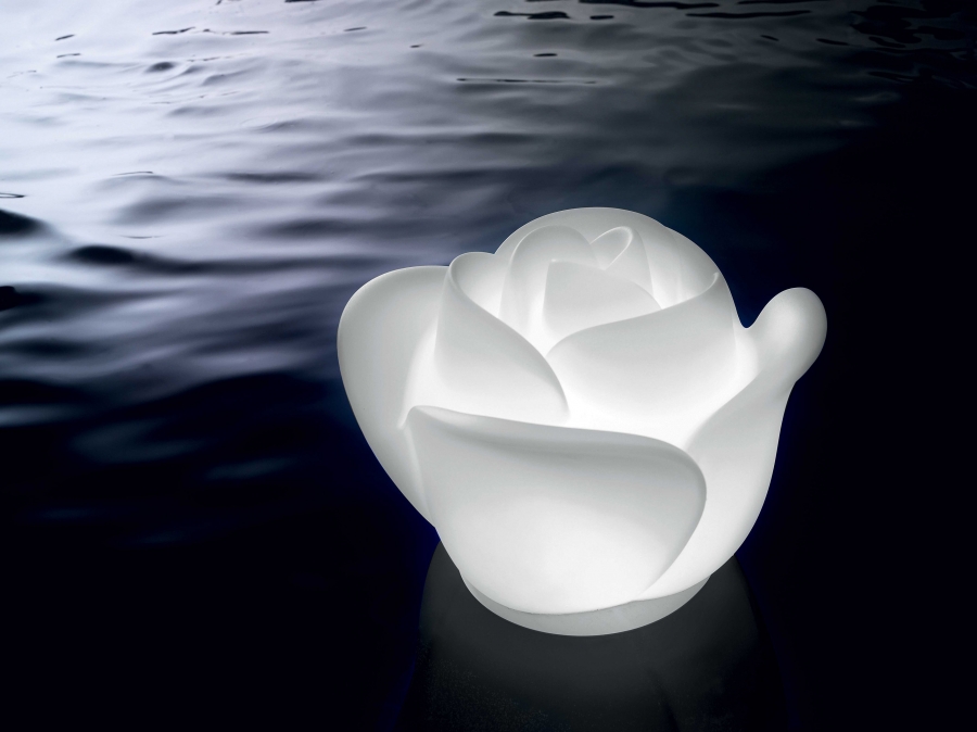 Die Rose von Baby Love erblüht auch im Freien: im Garten, in ihrem erwählten Freiraum, um auf romantische Weise die Sommerabende zu erhellen; oder auf dem Wasser, alleine, reihenweise oder traubenförmig angeordnet, wie eine magische Seerose aus wechselndem Licht in Pools und Brunnen, geboren, um Partys zu beleuchten. Stets zart, stimmungsvoll, unverwechselbar. Baby Love, eine Zierlampe mit dem stilisierten Profil einer Rose, welche verschiedene Formen annehmen kann: ein neuartiger Ständer, in verschiedenen Höhen verfügbar, eine elegante Bodenlampe, eine Deckenlampe, eine Wandlampe und eine Außenlampe in den Versionen Waterproof und Giardino, wo das Design ein rascherer Abfluss des Regenwassers begünstigen soll; Baby Love ist in fünf verschiedenen Farbabstufungen verfügbar und wird von einer Energiesparlampe beleuchtet. Baby Love Waterproof ist praktisch, handlich, stimmungsvoll und ist im Wasser in seinem Element, jedoch auch in jeder anderen Außeninstallation dank der Schutzklasse IP36 und der Basis aus satiniertem Edelstahl 316, die ein Umkippen verhindert. Die Mindestdauer der Batterie beträgt 8 Stunden, wobei sie durch Induktion wieder aufgeladen werden kann, d. h., ohne elektrischen Kontakt zwischen der Ladestation und der Batterie für maximale Sicherheit und Benutzerfreundlichkeit. Die Fernbedienung ermöglicht die Fernkontrolle auch von mehreren Lampen gleichzeitig. Baby Love Giardino ist hingegen durch ein Spitzpfahl fest im Boden verankert, außerdem ist ein Anschluss zum Stromnetz vorgesehen; ideal zur Gartenverzierung auf stimmungsvolle Weise.Glühbirnen nicht im Lieferumfang enthalten (Glühbirne max 32 Watt Energiesparlampe).