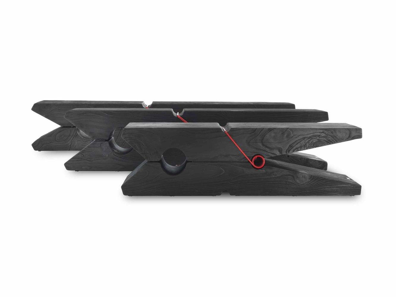 Le banc MOLLETTA flirt avec la création à grande échelle typique du pop art, conférant au bois de cèdre une interprétation hyper naturel. L’élément acquiert ainsi une double vie: la première est celle d’une assise spacieuse destinée aux grandes cours ou aux espaces publics. La deuxième est celle d’un puissant élément sculptural, en mesure de définir l’identité de l’espace environnant. Mais cette Moletta gigantesque est aussi un hommage au design simple avec lequel nous partageons silencieusement notre quotidien depuis toujours. Sa force esthétique doit beaucoup au travail ingénieux du bois massif que Riva1920 a cultivé au fil du temps. Sur cette assise en particulier les parties coupées en oblique exaltent les veines et les nuances du cèdre naturel, créant presque une texture virtuelle qui recouvre entièrement le meuble.