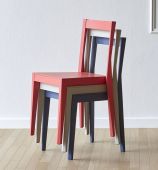 Emilia est une chaise aux coupes horizontales fortes, aux accents cubistes, qui joue parfois avec les couleurs, parfois avec les atmosphères, en