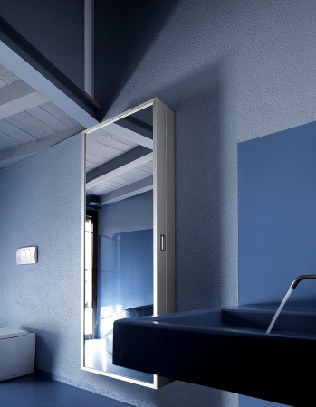C’est un Box plein d’idées: c’est ainsi que nous aimons imaginer ce meuble d’entrée mural, fruit de la créativité de Luciano Bertoncini. Un élément de mobilier à la fois simple et génial, au design minimal et aux fonctions multiples. Grâce à sa profondeur ne faisant que 20 cm, Box est un meuble de rangement qui se prête à être installé dans les espaces les plus variés d’une maison ou d’un bureau. Grâce à des tablettes spéciales inclinées en métal, Box devient un range-chaussures fonctionnel pouvant contenir jusqu’à 18 paires de chaussures. La version pour entrée est équipée, de haut en bas, de la façon suivante: des étagères où déposer des objets, puis trois patères en acier inox en forme de boucle et enfin la tablette du bas pouvant faire office de range-chaussures. De plus, n’oublions pas le miroir qui complète la fonctionnalité multiple de ce meuble. En fonction de la façon dont on dispose ses tablettes, le meuble Box peut devenir un range-CD, un range-DVD ou un espace multifonction où ranger des objets. Box est un meuble de rangement raffiné et fonctionnel, comme le démontrent tous ces détails: sa poignée encastrée, ses charnières escamotables, la possibilité d’être installé dans les deux sens, avec ouverture des portes à droite ou à gauche. Les portes ont un angle d’ouverture maxi de 180° et l’habillage du meuble, disponible en miroir ou en verre, a été réalisé selon tous les critères de sécurité.