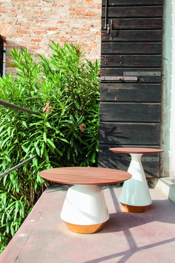 Série de petites tables avec base en céramique, disponibles en diverses finitions.