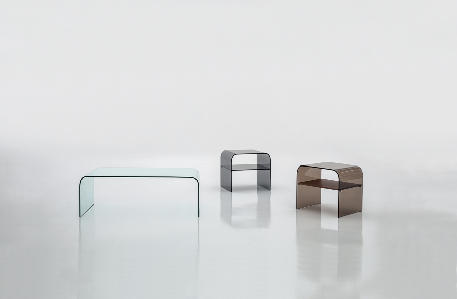Tables basses en verre incurvé disponibles en diverses finitions. Formes simples et organiques caractérisent Anemone.
