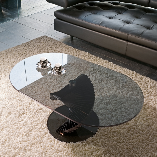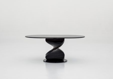 Petite table réalisée par de spéciales techniques de travail du verre. La base est une vraie et propre sculpture en verre qui génère mille reflets et rend singulière Ariel. Disponible en deux dimensions.