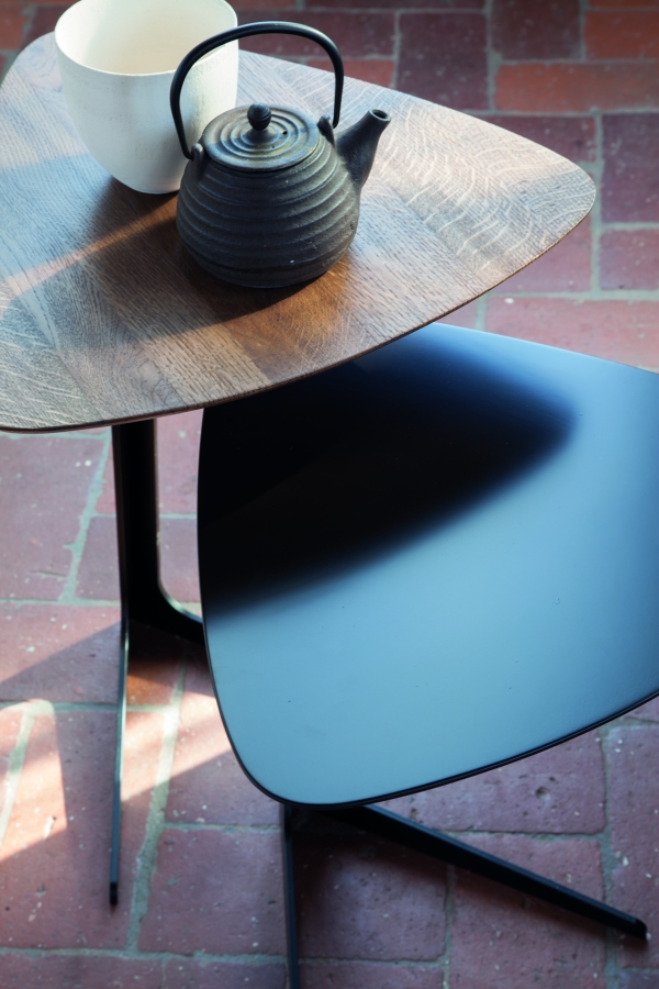 Petite desserte disponible en deux dimensions avec structure en métal et petit plateau en bois.