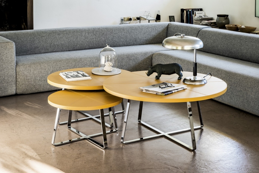 Dj est la table avec la base en forme de luge en acier chromé. Le top est recouvert de cuir ou cuir régénéré. Disponible en trois tailles: Ø100 Ø80 ou Ø60 cm
