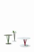 Le plateau des Kadou Coffee est en métal verni, disponible en blanc, gris anthracite et gris tourterelle. Les pieds, eux aussi en métal verni et placés asymétriquement par rapport à la base et au plateau, sont disponibles en neuf couleurs : les teintes plus classiques et les teintes plus vives.