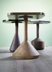 Bases en chêne massif ou noyer Canaletto et des formes géométriques et claires caractérisent ces tabourets et tables basses; des conceptions essentielles et sophistiqués permettent un placement dans une variété d'environnements.