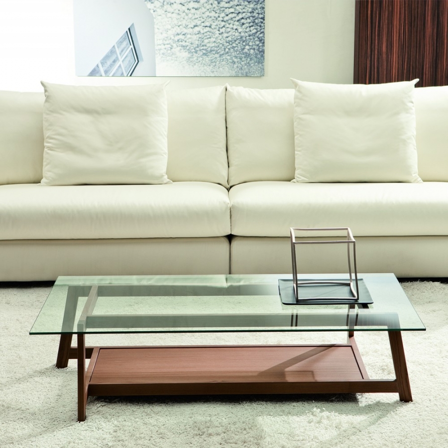 Petite table avec structure en frêne massif, plateau supérieur en verre et plateau inférieur en frêne plaqué.
