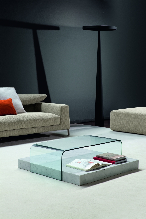 La petite table Ribbon, caractéristique du centre d’une pièce, a été crée à partir de l’association de deux éléments aux lignes simples, qui contrastent par la nature des matériaux qui les composent : la base est un bloc en marbre de Carrare brossé, alors que l’élément qui la surplombe est un « pont » constitué par une ligne fine en verre transparent ou noir fumé. Les deux éléments forment deux plans d’appui pratiques.