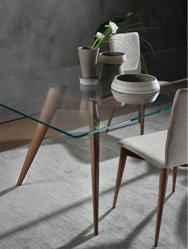 Novecento est une table qui synthétise de façon simple le style du design. Verre et/ou le bois, travaillé avec un profil particulier dans la structure de
